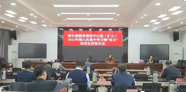 聚焦根本遵循,强化法治思想引领。将法治建设纳入全旗年度综合考核体系,五年来,各级中心组累计开展专题学习、研讨交流80余次,推动各级领导干部带头学思践悟。制定46个普法责任单位“谁执法谁普法”责任清单,明确重要节点普法宣传任务,实现普法工作常态化、制度化。组织开展法治讲座20余场,覆盖科级以上干部2000余人次,切实提升党员干部尊法学法守法用法意识。
